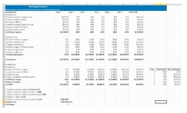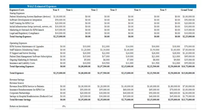 The financial analysis for HealthWays Clinic’s RPM system over the next five years indicates that the clinic will experience substantial initial and operational expenses, but these will be outweighed by projected revenues and savings over time. The total projected expenses over five years are estimated at $1.3 million. This includes a significant upfront investment of $225,000 to cover the setup costs. The five-year total annual operational costs will be about $1.075 million which includes system maintenance, IT support, staffing, and marketing expenditures.