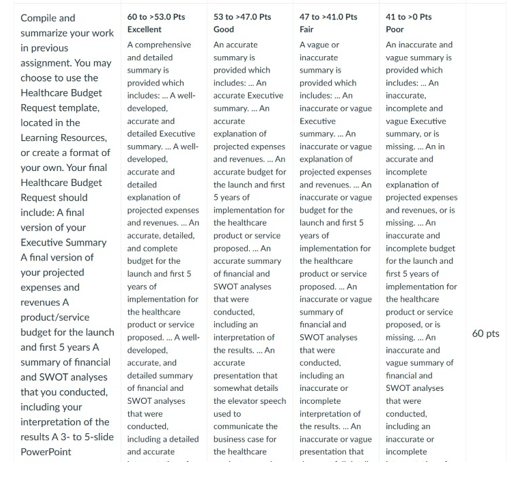 /ous Healthcare Budget Request assignment submissions, including your executive summary, your Expense/Revenue/ROI Analysis, your estimated budget, and your ratio analysis.