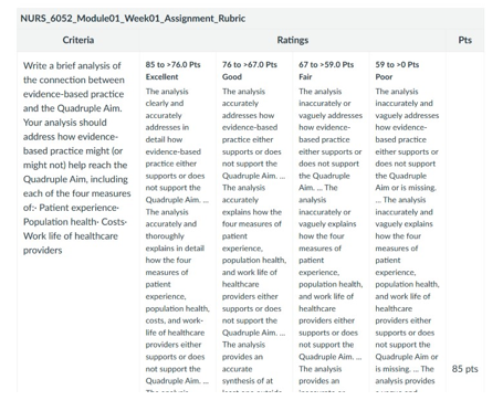 In today’s challenging healthcare landscape, organizations seek to optimize outcomes for patients and are equally focused on doing the same thing for providers and care delivery systems (Aminabee, 2024). To provide direction to these efforts, the Triple Aim was proposed, with an emphasis on improving the patient experience. Evidence-based practice (EBP) incorporates clinical experience, patient choice and the best available evidence. This discussion considers the intersection of EBP with the Quadruple Aim, and how EBP can promote quality care, improve community health, and make providers happier.
