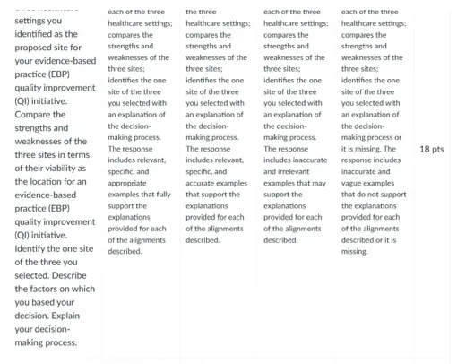 Describe each of the three healthcare settings you identified as the proposed site for your evidence-based practice (EBP) quality improvement (QI) initiative. Be sure to address the following questions about the site: