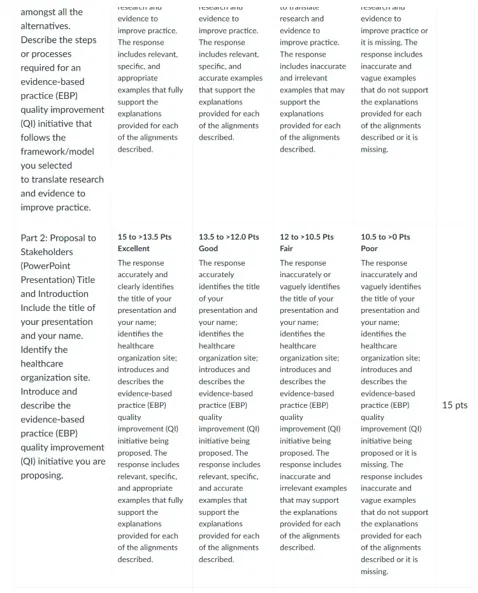 For Part 2, you will present your evidence-based practice (EBP) quality improvement (QI) initiative proposal to (hypothetical) stakeholders at the healthcare organization site. Your goal is to persuade and obtain approval for the EBP QI initiative you are proposing.