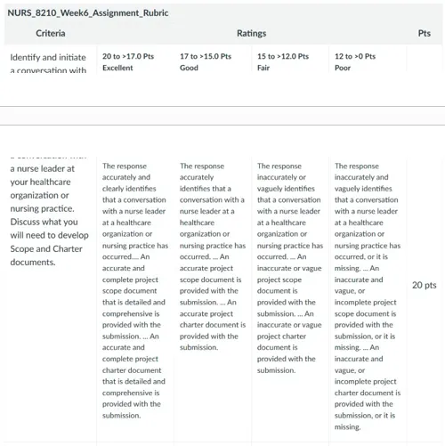 Identify and initiate a conversation with a nurse leader at your nursing practice or healthcare organization. Discuss what you will need to develop Scope and Charter Documents.