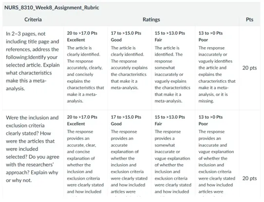 Answer 1: You can download a free NURS 8310 Week 8 Assignment Meta-Analysis sample from Tutors Academy for guidance and reference.